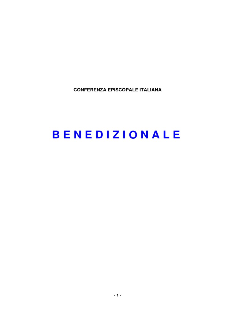 Indice....................................................................................................................................................2 P R E S E N T A Z I O N E* ...............................................................................................................8 CONGREGAZIONE DEL CULTO DIVINO ...................................................................................10 PREMESSE GENERALI ..................................................................................................................11 I. LA BENEDIZIONE NELLA STORIA DELLA SALVEZZA ..............................................11 II. LE BENEDIZIONI NELLA VITA DELLA CHIESA .........................................................12 III. UFFICI E MINISTERI ........................................................................................................14 IV. CELEBRAZIONE DELLA BENEDIZIONE......................................................................15 V. ADATTAMENTI CHE SPETTANO ALLE CONFERENZE EPISCOPALI......................18
