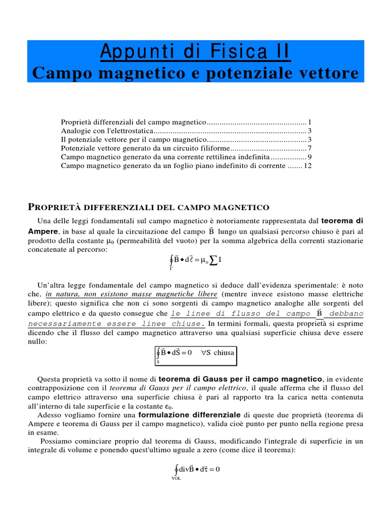 Campo magnetico generato da un foglio piano indefinito di corrente ....... 12