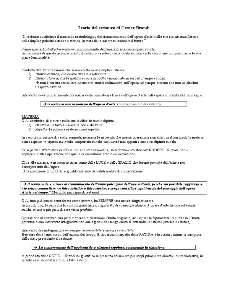 Il restauro costituisce il momento metodologico del riconoscimento dellopera darte nella sua consistenza fisica e nella duplice polarit estetica e storica, in vista della sua trasmissione nel futuro. Primo momento dellintervento riconoscimento dellopera darte come opera darte. In mancanza di questo riconoscimento il restauro va inteso come qualsiasi intervento con il fine di ripristinarne la sua piena funzionalit. Prodotto dellattivit umana che si manifesta in una duplice istanza: 1) Istanza estetica, che deriva dalla sua artisticit 2) Istanza storica, che la qualifica come prodotto umano nato in un certo tempo e luogo. non coretto cancellare documenti storici sedimentati sullopera nel tempo, a meno che non ne alterino laspetto estetico. Intervento deve primariamente occuparsi della consistenza fisica dellopera darte nella quale si manifesta limmagine