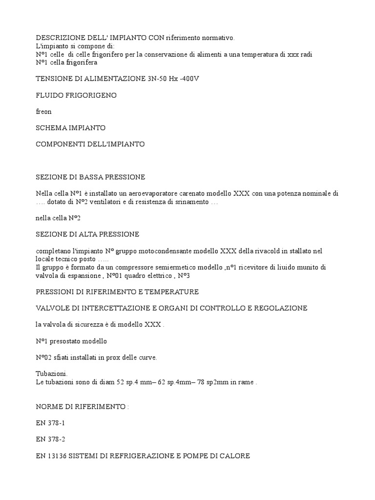 SEZIONE DI BASSA PRESSIONE Nella cella N1 installato un aeroevaporatore carenato modello XXX con una potenza nominale di . dotato di N2 ventilatori e di resistenza di srinamento nella cella N2 SEZIONE DI ALTA PRESSIONE completano l'impianto N gruppo motocondensante modello XXX della rivacold in stallato nel locale tecnico posto .. Il gruppo formato da un compressore semiermetico modello ,n1 ricevitore di liuido munito di valvola di espansione , N01 quadro elettrico , N3 PRESSIONI DI RIFERIMENTO E TEMPERATURE VALVOLE DI INTERCETTAZIONE E ORGANI DI CONTROLLO E REGOLAZIONE la valvola di sicurezza di modello XXX . N1 presostato modello N02 sfiati installati in prox delle curve. Tubazioni. Le tubazioni sono di diam 52 sp.4 mm 62 sp.4mm 78 sp2mm in rame . NORME DI RIFERIMENTO : EN 378-1 EN 378-2 EN 13136 SISTEMI DI REFRIGERAZIONE E POMPE DI CALORE