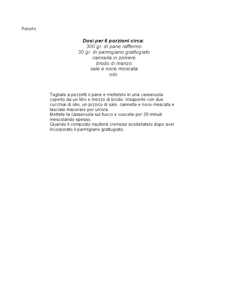 Dosi per 6 porzioni circa: 300 gr. di pane raffermo 30 gr. di parmigiano grattugiato cannella in polvere brodo di manzo sale e noce moscata olio