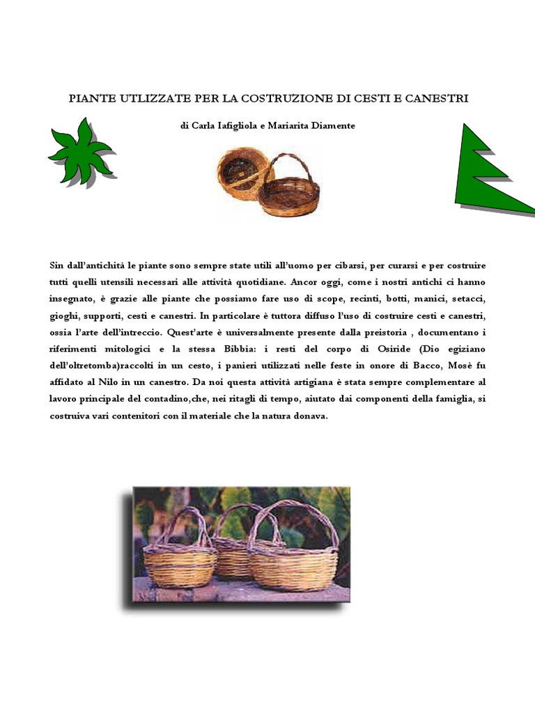 Sin dallantichit le piante sono sempre state utili alluomo per cibarsi, per curarsi e per costruire tutti quelli utensili necessari alle attivit quotidiane. Ancor oggi, come i nostri antichi ci hanno insegnato, grazie alle piante che possiamo fare uso di scope, recinti, botti, manici, setacci, gioghi, supporti, cesti e canestri. In particolare tuttora diffuso luso di costruire cesti e canestri, ossia larte dellintreccio. Questarte universalmente presente dalla preistoria , documentano i riferimenti mitologici e la stessa Bibbia: i resti del corpo di Osiride (Dio egiziano delloltretomba)raccolti in un cesto, i panieri utilizzati nelle feste in onore di Bacco, Mos fu affidato al Nilo in un canestro. Da noi questa attivit artigiana stata sempre complementare al lavoro principale del contadino,che, nei ritagli di tempo, aiutato dai componenti della famiglia, si costruiva vari contenitori con il materiale che la natura donava.