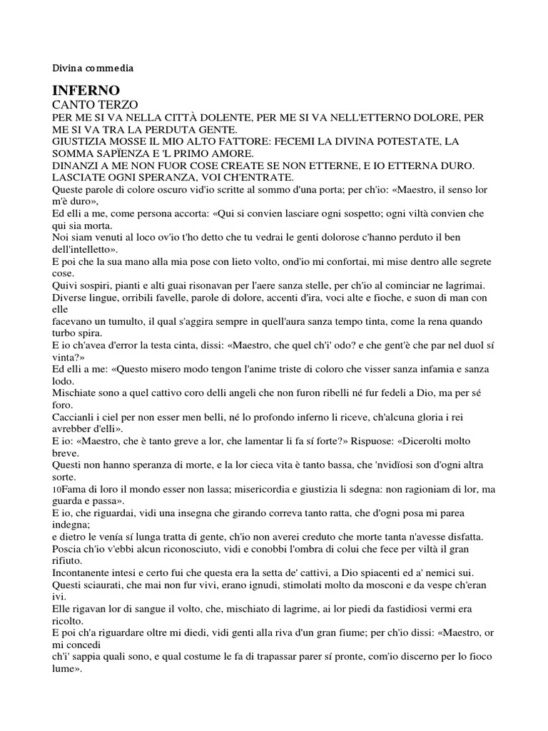 PER ME SI VA NELLA CITT DOLENTE, PER ME SI VA NELL'ETTERNO DOLORE, PER ME SI VA TRA LA PERDUTA GENTE. GIUSTIZIA MOSSE IL MIO ALTO FATTORE: FECEMI LA DIVINA POTESTATE, LA SOMMA SAPENZA E 'L PRIMO AMORE. DINANZI A ME NON FUOR COSE CREATE SE NON ETTERNE, E IO ETTERNA DURO. LASCIATE OGNI SPERANZA, VOI CH'ENTRATE. Queste parole di colore oscuro vid'io scritte al sommo d'una porta; per ch'io: Maestro, il senso lor m' duro, Ed elli a me, come persona accorta: Qui si convien lasciare ogni sospetto; ogni vilt convien che qui sia morta. Noi siam venuti al loco ov'io t'ho detto che tu vedrai le genti dolorose c'hanno perduto il ben dell'intelletto. E poi che la sua mano alla mia pose con lieto volto, ond'io mi confortai, mi mise dentro alle segrete cose. Quivi sospiri, pianti e alti guai risonavan per l'aere sanza stelle, per ch'io al cominciar ne lagrimai. Diverse lingue, orribili favelle, parole di dolore, accenti d'ira, voci alte e fioche, e suon di man con elle facevano un tumulto, il qual s'aggira sempre in quell'aura sanza tempo tinta, come la rena quando turbo spira. E io ch'avea d'error la testa cinta, dissi: Maestro, che quel ch'i' odo? e che gent' che par nel duol s vinta? Ed elli a me: Questo misero modo tengon l'anime triste di coloro che visser sanza infamia e sanza lodo. Mischiate sono a quel cattivo coro delli angeli che non furon ribelli n fur fedeli a Dio, ma per s foro. Caccianli i ciel per non esser men belli, n lo profondo inferno li riceve, ch'alcuna gloria i rei avrebber d'elli. E io: Maestro, che tanto greve a lor, che lamentar li fa s forte? Rispuose: Dicerolti molto breve. Questi non hanno speranza di morte, e la lor cieca vita tanto bassa, che 'nvidosi son d'ogni altra sorte. 10Fama di loro il mondo esser non lassa; misericordia e giustizia li sdegna: non ragioniam di lor, ma guarda e passa. E io, che riguardai, vidi una insegna che girando correva tanto ratta, che d'ogni posa mi parea indegna; e dietro le vena s lunga tratta di gente, ch'io non averei creduto che morte tanta n'avesse disfatta. Poscia ch'io v'ebbi alcun riconosciuto, vidi e conobbi l'ombra di colui che fece per vilt il gran rifiuto. Incontanente intesi e certo fui che questa era la setta de' cattivi, a Dio spiacenti ed a' nemici sui. Questi sciaurati, che mai non fur vivi, erano ignudi, stimolati molto da mosconi e da vespe ch'eran ivi. Elle rigavan lor di sangue il volto, che, mischiato di lagrime, ai lor piedi da fastidiosi vermi era ricolto. E poi ch'a riguardare oltre mi diedi, vidi genti alla riva d'un gran fiume; per ch'io dissi: Maestro, or mi concedi ch'i' sappia quali sono, e qual costume le fa di trapassar parer s pronte, com'io discerno per lo fioco lume.