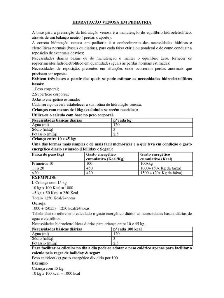 s x aporte); A correta hidratao venosa em pediatria o conhecimento das necessidades hdricas e eletrolticas normais (basais ou dirias), para cada faixa etria ou ponderal e de como conduzir a reposio de eventuais desvios; Necessidades dirias basais ou de manuteno manter o equilbrio zero, fornecer os requerimentos hidroeletroltico em quantidades iguais as perdas normais estimadas; Necessidades de reposio, presentes em situaes onde ocorreram perdas anormais que precisam ser repostas. Existem trs bases a partir das quais se pode estimar as necessidades hidroeletrolticas basais: 1.Peso corporal; 2.Superficie corprea; 3.Gasto energtico estimado; Cada servio devera estabelecer a sua rotina de hidratao venosa. Crianas com menos de 10kg (excluindo-se recm nascidos): Utiliza-se o calculo com base no peso corporal. Necessidades bsicas dirias p/ cada kg Agua (ml) 120 Sdio (mEq) 3 Potssio (mEq) 2,5 Criana entre 10 e 45 kg: Uma das formas mais simples e de mais fcil memorizar e a que leva em condio o gasto energtico dirio estimado (Holliday e Segar): Faixa de peso (kg) Gasto energtico Gasto energtico cumulativo (Kcal/Kg) cumulativo (Kcal) Primeiros 10 100 100xkg 11 a 20 +50 1000+ (50x Kg da faixa) >20 +20 1500 + (20x Kg da faixa) EXEMPLOS: I. Criana com 15 kg 10 kg x 100 Kcal = 1000 +5 kg x 50 Kcal = 250 Kcal Total= 1250 Kcal/24horas. Ou seja 1000 + (50x5)= 1250 kcal/24horas Tabela abaixo refere se o calculado o gasto energtico dirio, as necessidades basais dirias de agua e eletrlitos. Necessidades hidroeletrolticas dirias para criana entre 10 e 45 kg. Necessidades bsicas dirias p/ cada 100 kcal Agua (ml) 120 Sdio (mEq) 3 Potssio (mEq) 2,5 Para facilitar os clculos no dia a dia pode-se adotar o peso calrico apenas para facilitar o calculo pela regra de holliday & segar: Peso calrico(kg) gasto energtico dividido por 100. Exemplo Criana com 15 kg: 10 kg x 100 kcal = 1000 kcal