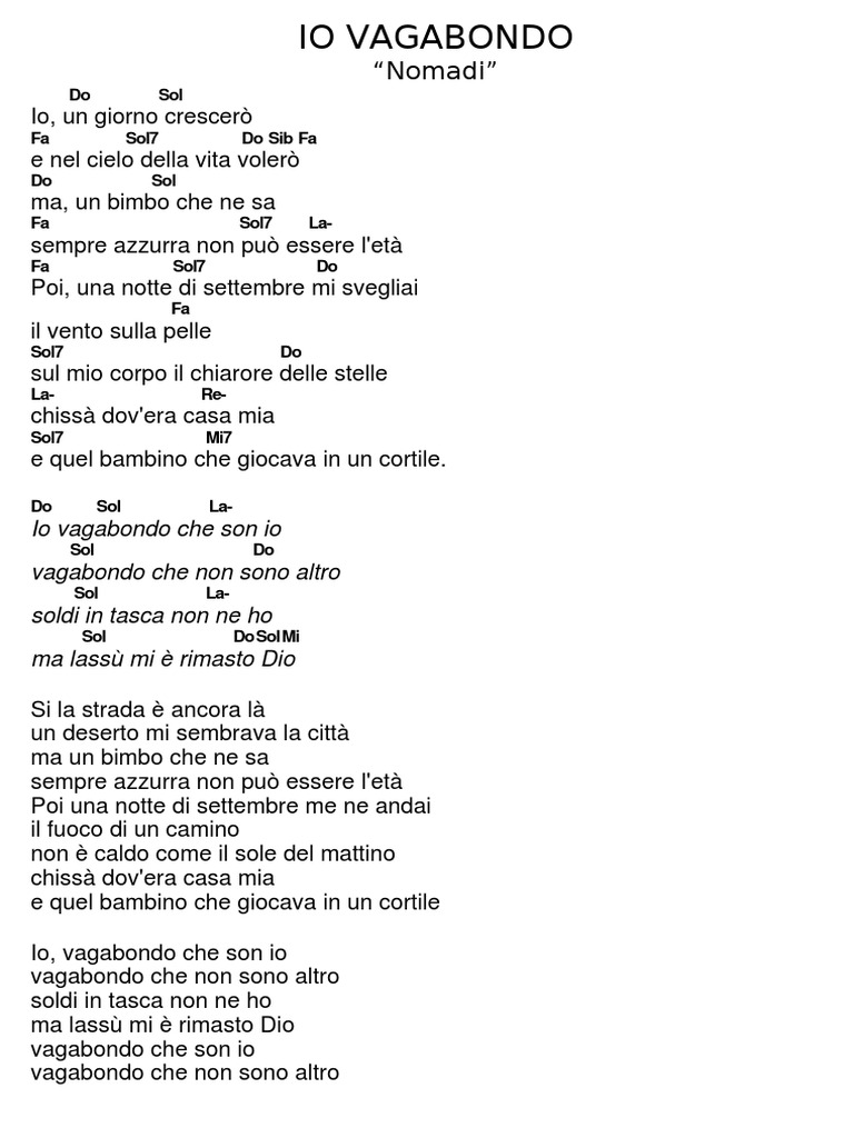 Io vagabondo che son io vagabondo che non sono altro soldi in tasca non ne ho ma lass mi rimasto Dio Si la strada ancora l un deserto mi sembrava la citt ma un bimbo che ne sa sempre azzurra non pu essere l'et Poi una notte di settembre me ne andai il fuoco di un camino non caldo come il sole del mattino chiss dov'era casa mia e quel bambino che giocava in un cortile Io, vagabondo che son io vagabondo che non sono altro soldi in tasca non ne ho ma lass mi rimasto Dio vagabondo che son io vagabondo che non sono altro