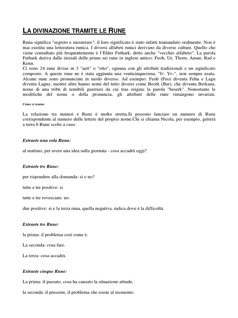 La relazione tra numeri e Rune molto [Link] possono lanciare un numero di Rune corrispondente al numero delle lettere del proprio [Link] si chiama Nicola, per esempio, getter a terra 6 Rune scelte a caso.