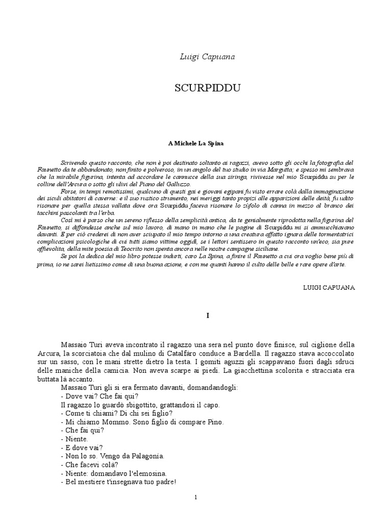 A Michele La Spina Scrivendo questo racconto, che non poi destinato soltanto ai ragazzi, avevo sotto gli occhi la fotografia del Faunetto da te abbandonato, non finito e polveroso, in un angolo del tuo studio in via Margutta; e spesso mi sembrava che la mirabile figurina, intenta ad accordare le cannucce della sua siringa, rivivesse nel mio Scurpiddu su per le colline dell' rcura o sotto gli ulivi del !iano del "alluzzo# Forse, in tempi remotissimi, qualcuno di questi gai e giovani egipani fu visto errare col$ dalla immaginazione dei siculi abitatori di caverne% e il suo rustico strumento, nei meriggi tanto propizi alle apparizioni delle deit$, fu udito risonare per quella stessa vallata dove ora Scurpiddu faceva risonare lo z&folo di canna in mezzo al branco dei tacchini pascolanti tra l'erba# Cos' mi parso che un sereno riflesso della semplicit$ antica, da te genialmente riprodotta nella figurina del Faunetto, si diffondesse anche sul mio lavoro, di mano in mano che le pagine di Scurpiddu mi si ammucchiavano davanti# ( per ci) crederei di non aver sciupato il mio tempo intorno a una creatura affatto ignara delle tormentatrici complicazioni psicologiche di cui tutti siamo vittime oggid', se i lettori sentissero in questo racconto un'eco, sia pure affievolita, della mite poesia di *eocrito non spenta ancora nelle nostre campagne siciliane# Se poi la dedica del mio libro potesse indurti, caro La Spina, a finire il Faunetto a cui ora voglio bene pi& di prima, io ne sarei lietissimo come di una buona azione, e con me quanti hanno il culto delle belle e rare opere d'arte#