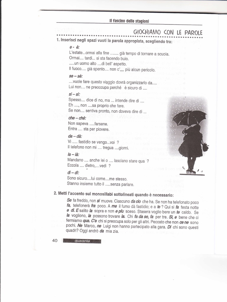 2. Metti I'accento sui monosiilabi sottolineati quando d necessario: Se fa freddo, non si muove, Ciascuno da cio che ha. Se non