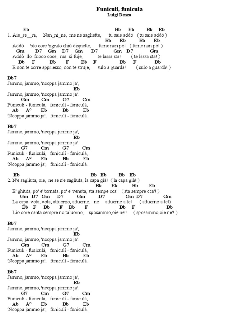 Bb7 Jammo, jammo, 'ncoppa jammo ja', Eb Jammo, jammo, 'ncoppa jammo ja'. Gm Cm G7 Cm Funicul - funicul, funicul - funicul, Ab A Eb Bb Eb 'Ncoppa jammo ja', funicul - funicul. Bb7 Jammo, jammo, 'ncoppa jammo ja', Eb Jammo, jammo, 'ncoppa jammo ja'. G7 Cm G7 Cm Funicul - funicul, funicul - funicul, Ab A Eb Bb Eb 'Ncoppa jammo ja', funicul - funicul. Eb Bb Eb Bb Eb 2. N'e sagliuta, oie, ne se n'e sagliuta, la capa gi! ( la capa gi! ) Bb Eb Bb Eb E' ghiuta, po' e' tornata, po' e' venuta, sta sempe cca'! ( sta sempre cca'! ) Gm D7 Gm D7 Gm D7 Gm D7 Gm La capa vota, vota, attuorno, attuorno, no attuorno a te! ( attuorno a te!) Bb F Bb F Bb F Bb F Bb Lio core canta sempre no taluorno, sposammo,oie ne'! ( sposammo,oie ne'! ) Bb7 Jammo, jammo, 'ncoppa jammo ja', Eb Jammo, jammo, 'ncoppa jammo ja'. Gm Cm G7 Cm Funicul - funicul, funicul - funicul, Ab A Eb Bb Eb 'Ncoppa jammo ja', funicul - funicul. Bb7 Jammo, jammo, 'ncoppa jammo ja', Eb Jammo, jammo, 'ncoppa jammo ja'. G7 Cm G7 Cm Funicul - funicul, funicul - funicul, Ab A Eb Bb Eb 'Ncoppa jammo ja', funicul - funicul.