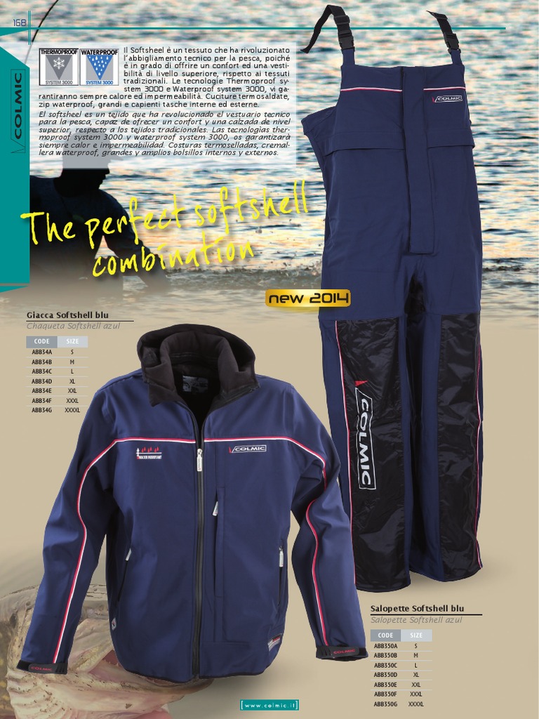 Il Softsheel un tessuto che ha rivoluzionato labbigliamento tecnico per la pesca, poich in grado di offrire un confort ed una vestibilit di livello superiore, rispetto ai tessuti tradizionali. Le tecnologie Thermoproof system 3000 e Waterproof system 3000, vi garantiranno sempre calore ed impermeabilit. Cuciture termosaldate, zip waterproof, grandi e capienti tasche interne ed esterne. El softsheel es un tejido que ha revolucionado el vestuario tecnico para la pesca, capaz de ofrecer un confort y una calzada de nivel superior, respecto a los tejidos tradicionales. Las tecnologas thermoproof system 3000 y waterproof system 3000, os garantizar siempre calor e impermeabilidad. Costuras termoselladas, cremallera waterproof, grandes y amplios bolsillos internos y externos.