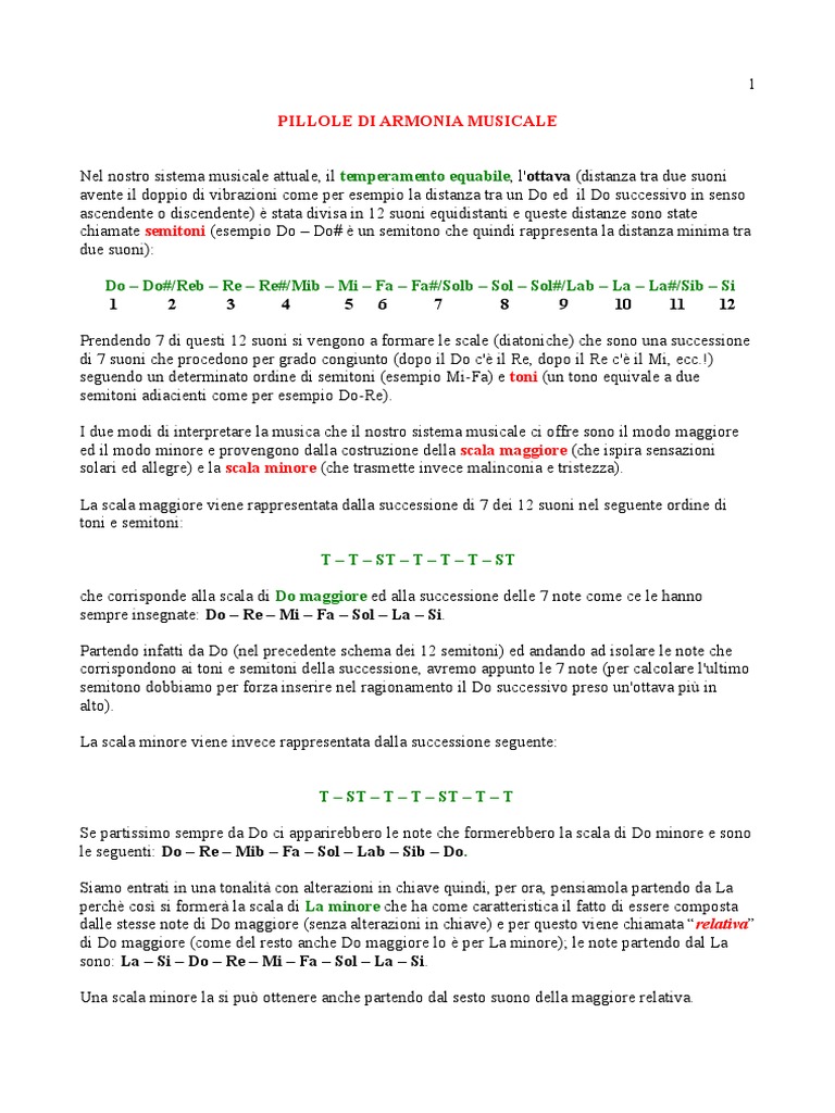 avente il doppio di vibrazioni come per esempio la distanza tra un Do ed il Do successivo in senso ascendente o discendente) stata divisa in 12 suoni equidistanti e queste distanze sono state chiamate semitoni (esempio Do Do# un semitono che quindi rappresenta la distanza minima tra due suoni) Do Do# Reb Re Re# Mib Mi !a !a# Solb Sol Sol# Lab La La# Sib Si " # $ % & ' ( ) * "+ "" "# !rendendo " di questi 12 suoni si ven#ono a $ormare le scale (diatoniche) che sono una successione di " suoni che procedono per #rado con#iunto (dopo il Do c' il %e, dopo il %e c' il &i, ecc'() se#uendo un determinato ordine di semitoni (esempio &i)*a) e toni (un tono equivale a due semitoni adiacienti come per esempio Do)%e)' + due modi di interpretare la musica che il nostro sistema musicale ci o$$re sono il modo ma##iore ed il modo minore e proven#ono dalla costruzione della s,ala ma--iore (che ispira sensazioni solari ed alle#re) e la s,ala minore (che trasmette invece malinconia e tristezza)' ,a scala ma##iore viene rappresentata dalla successione di " dei 12 suoni nel se#uente ordine di toni e semitoni . . S. . . . S. che corrisponde alla scala di Do ma--iore ed alla successione delle " note come ce le hanno sempre inse#nate Do Re Mi !a Sol La Si' !artendo in$atti da Do (nel precedente schema dei 12 semitoni) ed andando ad isolare le note che corrispondono ai toni e semitoni della successione, avremo appunto le " note (per calcolare l'ultimo semitono dobbiamo per $orza inserire nel ra#ionamento il Do successivo preso un'ottava pi- in alto)' ,a scala minore viene invece rappresentata dalla successione se#uente . S. . . S. . . .e partissimo sempre da Do ci apparirebbero le note che $ormerebbero la scala di Do minore e sono le se#uenti Do Re Mib !a Sol Lab Sib Do/ .iamo entrati in una tonalit/ con alterazioni in chiave quindi, per ora, pensiamola partendo da ,a perch cos0 si $ormer/ la scala di La minore che ha come caratteristica il $atto di essere composta dalle stesse note di Do ma##iore (senza alterazioni in chiave) e per questo viene chiamata 1relativa2 di Do ma##iore (come del resto anche Do ma##iore lo per ,a minore)3 le note partendo dal ,a sono La Si Do Re Mi !a Sol La Si' 4na scala minore la si pu5 ottenere anche partendo dal sesto suono della ma##iore relativa'