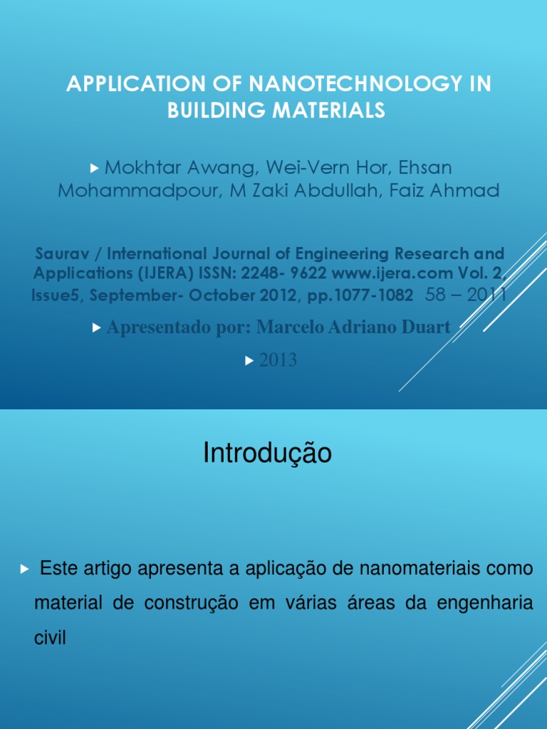 Este artigo apresenta a aplicao de nanomateriais como material de construo em vrias reas da engenharia civil