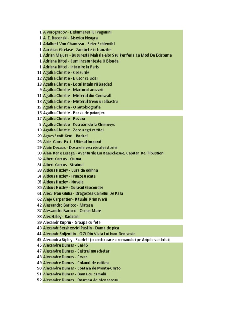 A Vinogradov - Defaimarea lui Paganini A. E. Baconski - Biserica Neagra Adalbert Von Chamisso - Peter Schlemihl Aurelian Ghelase - Zambete in tranzitie Adrian Majuru - Bucurestii Mahalalelor Sau Periferia Ca Mod De Existenta Adriana Bittel - Cum Incarunteste O Blonda Adriana Bittel - Intalnire la Paris Agatha Christie - Ceasurile Agatha Christie - E usor sa ucizi Agatha Christie - Locul Intalnirii Bagdad Agatha Christie - Martorul acuzarii Agatha Christie - Misterul din Cornwall Agatha Christie - Misterul trenului albastru Agatha Christie - O autobiografie Agatha Christie - Panza de paianjen Agatha Christie - Povara Agatha Christie - Secretul de la Chimneys Agatha Christie - Zece negri mititei Agnes Scott Kent - Rachel Aisin-Gloru-Pu-i - Ultimul imparat Alain Decaux - Dosarele secrete ale istoriei Alain Rene Lesage - Aventurile Lui Beauchesne, Capitan De Flibustieri Albert Camus - Ciuma Albert Camus - Strainul Aldous Huxley - Cura de odihna Aldous Huxley - Frunze uscate Aldous Huxley - Nuvele Aldous Huxley - Sursul Giocondei Alecu Ivan Ghilia - Dragostea Cainelui De Paza Alejo Carpentier - Ritualul Primaverii Alessandro Baricco - Matase Alessandro Baricco - Ocean Mare Alex Haley - Radacini Alexandr Kuprin - Groapa cu fete Alexandr Sergheevici Puskin - Dama de pica Alexandr Soljenitin - O Zi Din Viata Lui Ivan Denisovic Alexandra Ripley - Scarlett (o continuare a romanului pe Aripile vantului) Alexandre Dumas - Cei 45 Alexandre Dumas - Cei trei muschetari Alexandre Dumas - Cezar Alexandre Dumas - Colanul de catifea Alexandre Dumas - Contele de Monte-Cristo Alexandre Dumas - Dama cu camelii Alexandre Dumas - Doamna de Monsoreau