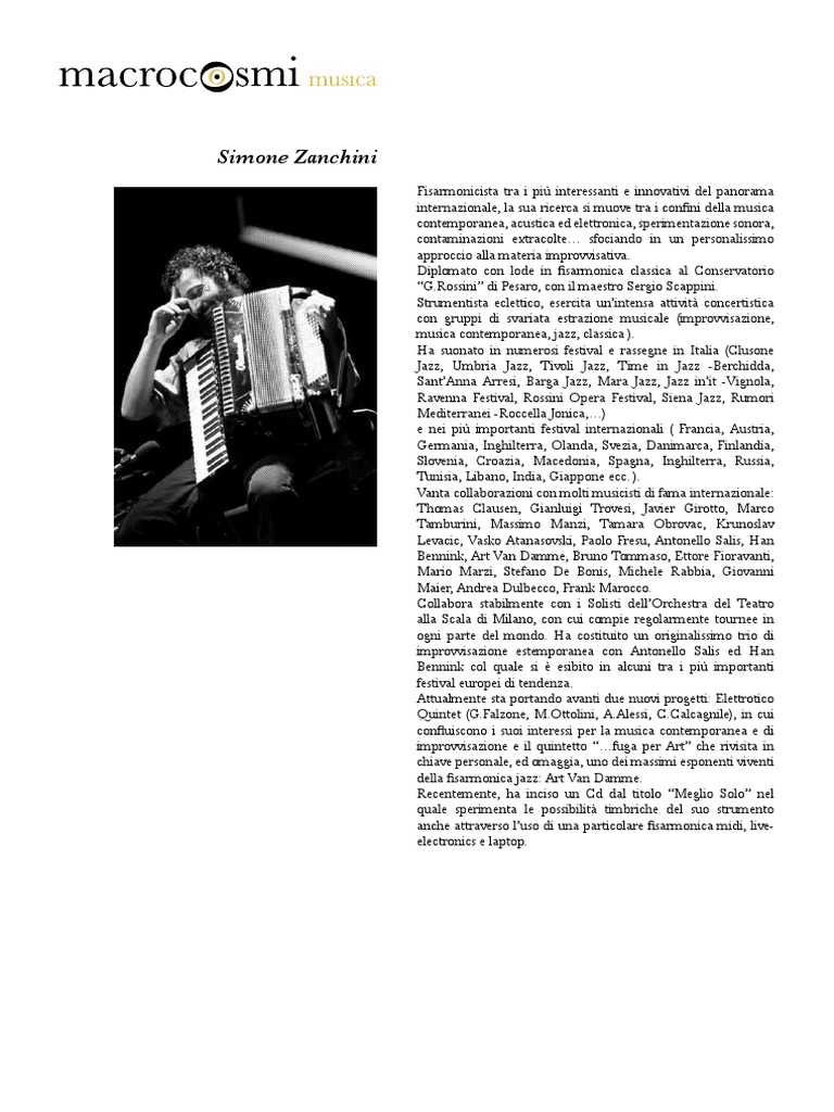 Fisarmonicista tra i pi interessanti e innovativi del panorama internazionale, la sua ricerca si muove tra i confini della musica contemporanea, acustica ed elettronica, sperimentazione sonora, contaminazioni extracolte sfociando in un personalissimo approccio alla materia improvvisativa. Diplomato con lode in fisarmonica classica al Conservatorio [Link] di Pesaro, con il maestro Sergio Scappini. Strumentista eclettico, esercita unintensa attivit concertistica con gruppi di svariata estrazione musicale (improvvisazione, musica contemporanea, jazz, classica ). Ha suonato in numerosi festival e rassegne in Italia (Clusone Jazz, Umbria Jazz, Tivoli Jazz, Time in Jazz -Berchidda, SantAnna Arresi, Barga Jazz, Mara Jazz, Jazz init -Vignola, Ravenna Festival, Rossini Opera Festival, Siena Jazz, Rumori Mediterranei -Roccella Jonica,) e nei pi importanti festival internazionali ( Francia, Austria, Germania, Inghilterra, Olanda, Svezia, Danimarca, Finlandia, Slovenia, Croazia, Macedonia, Spagna, Inghilterra, Russia, Tunisia, Libano, India, Giappone ecc. ). Vanta collaborazioni con molti musicisti di fama internazionale: Thomas Clausen, Gianluigi Trovesi, Javier Girotto, Marco Tamburini, Massimo Manzi, Tamara Obrovac, Krunoslav Levacic, Vasko Atanasovski, Paolo Fresu, Antonello Salis, Han Bennink, Art Van Damme, Bruno Tommaso, Ettore Fioravanti, Mario Marzi, Stefano De Bonis, Michele Rabbia, Giovanni Maier, Andrea Dulbecco, Frank Marocco. Collabora stabilmente con i Solisti dellOrchestra del Teatro alla Scala di Milano, con cui compie regolarmente tournee in ogni parte del mondo. Ha costituito un originalissimo trio di improvvisazione estemporanea con Antonello Salis ed Han Bennink col quale si esibito in alcuni tra i pi importanti festival europei di tendenza. Attualmente sta portando avanti due nuovi progetti: Elettrotico Quintet ([Link], [Link], [Link], [Link]), in cui confluiscono i suoi interessi per la musica contemporanea e di improvvisazione e il quintetto fuga per Art che rivisita in chiave personale, ed omaggia, uno dei massimi esponenti viventi della fisarmonica jazz: Art Van Damme. Recentemente, ha inciso un Cd dal titolo Meglio Solo nel quale sperimenta le possibilit timbriche del suo strumento anche attraverso luso di una particolare fisarmonica midi, liveelectronics e laptop.