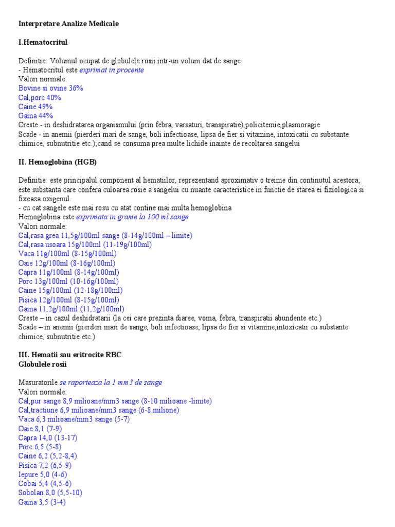 Hematocritul Definitie: Volumul ocupat de globulele rosii intr-un volum dat de sange - Hematocritul este exprimat in procente Valori normale: Bovine si ovine 36% Cal,porc 4 % Caine 4!% "aina 44% Creste - in des#idratarea organismului $prin febra, varsaturi, transpiratie%,policitemie,plasmoragie &cade - in anemii $pierderi mari de sange, boli infectioase, lipsa de fier si vitamine, into'icatii cu substante c#imice, subnutritie etc(%)cand se consuma prea multe lic#ide inainte de recoltarea sangelui II. Hemoglobina (HGB) Definitie: este principalul component al #ematiilor, repre*entand apro'imativ o treime din continutul acestora) este substanta care confera culoarea rosie a sangelui cu nuante caracteristice in functie de starea ei fi*iologica si fi'ea*a o'igenul( - cu cat sangele este mai rosu cu atat contine mai multa #emoglobina Hemoglobina este exprimata in grame la 100 ml sange Valori normale: Cal,rasa grea ++,,g-+ ml sange $.-+4g-+ ml / limite% Cal,rasa usoara +,g-+ ml $++-+!g-+ ml% Vaca ++g-+ ml $.-+,g-+ ml% 0aie +1g-+ ml $.-+6g-+ ml% Capra ++g-+ ml $.-+4g-+ ml% 2orc +3g-+ ml $+ -+6g-+ ml% Caine +,g-+ ml $+1-+.g-+ ml% 2isica +1g-+ ml $.-+,g-+ ml% "aina ++,1g-+ ml $++,1g-+ ml% Creste / in ca*ul des#idratarii $la cei care pre*inta diaree, voma, febra, transpiratii abundente etc(% &cade / in anemii $pierderi mari de sange, boli infectioase, lipsa de fier si vitamine,into'icatii cu substante c#imice, subnutritie etc(% III. Hematii sau eritrocite RBC Globulele rosii 3asuratorile se raporteaza la 1 mm3 de sange Valori normale: Cal,pur sange .,! milioane-mm3 sange $.-+ milioane -limite% Cal,tractiune 6,! milioane-mm3 sange $6-. milione% Vaca 6,3 milioane-mm3 sange $,-4% 0aie .,+ $4-!% Capra +4, $+3-+4% 2orc 6,, $,-.% Caine 6,1 $,,1-.,4% 2isica 4,1 $6,,-!% 5epure ,, $4-6% Cobai ,,4 $4,,-6% &obolan ., $,,,-+ % "aina 3,, $3-4%
