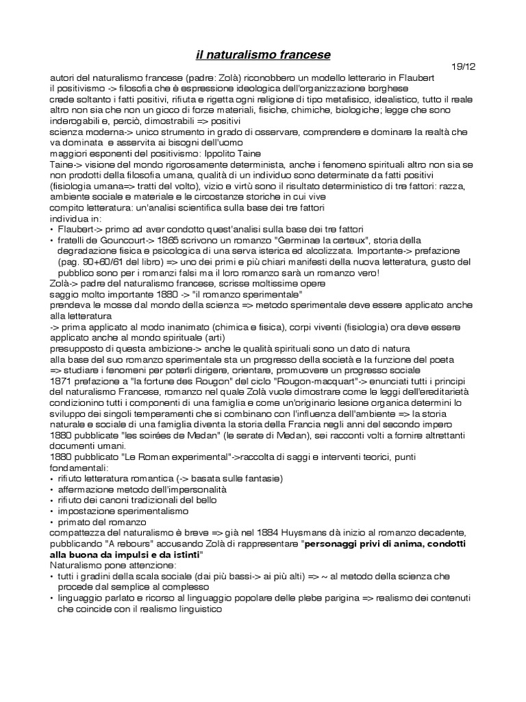 19/12! autori del naturalismo francese (padre: Zol) riconobbero un modello letterario in Flaubert ! il positivismo -> losoa che espressione ideologica dell'organizzazione borghese! crede soltanto i fatti positivi, riuta e rigetta ogni religione di tipo metasico, idealistico, tutto il reale altro non sia che non un gioco di forze materiali, siche, chimiche, biologiche; legge che sono inderogabili e, perci, dimostrabili => positivi! scienza moderna-> unico strumento in grado di osservare, comprendere e dominare la realt che va dominata e asservita ai bisogni dell'uomo ! maggiori esponenti del positivismo: Ippolito Taine! Taine-> visione del mondo rigorosamente determinista, anche i fenomeno spirituali altro non sia se non prodotti della losoa umana, qualit di un individuo sono determinate da fatti positivi (siologia umana=> tratti del volto), vizio e virt sono il risultato deterministico di tre fattori: razza, ambiente sociale e materiale e le circostanze storiche in cui vive! compito letteratura: un'analisi scientica sulla base dei tre fattori ! individua in:! Flaubert-> primo ad aver condotto quest'analisi sulla base dei tre fattori! fratelli de Gouncourt-> 1865 scrivono un romanzo "Germinae la certeux", storia della degradazione sica e psicologica di una serva isterica ed alcolizzata. Importante-> prefazione (pag. 90+60/61 del libro) => uno dei primi e pi chiari manifesti della nuova letteratura, gusto del pubblico sono per i romanzi falsi ma il loro romanzo sar un romanzo vero! Zol-> padre del naturalismo francese, scrisse moltissime opere! saggio molto importante 1880 -> "il romanzo sperimentale"! prendeva le mosse dal mondo della scienza => metodo sperimentale deve essere applicato anche alla letteratura! -> prima applicato al modo inanimato (chimica e sica), corpi viventi (siologia) ora deve essere applicato anche al mondo spirituale (arti) ! presupposto di questa ambizione-> anche le qualit spirituali sono un dato di natura ! alla base del suo romanzo sperimentale sta un progresso della societ e la funzione del poeta => studiare i fenomeni per poterli dirigere, orientare, promuovere un progresso sociale! 1871 prefazione a "la fortune des Rougon" del ciclo "Rougon-macquart"-> enunciati tutti i principi del naturalismo Francese, romanzo nel quale Zol vuole dimostrare come le leggi dell'ereditariet condizionino tutti i componenti di una famiglia e come un'originario lesione organica determini lo sviluppo dei singoli temperamenti che si combinano con l'inuenza dell'ambiente => la storia naturale e sociale di una famiglia diventa la storia della Francia negli anni del secondo impero! 1880 pubblicate "les soires de Medan" (le serate di Medan), sei racconti volti a fornire altrettanti documenti umani.! 1880 pubblicato "Le Roman experimental"->raccolta di saggi e interventi teorici, punti fondamentali:! riuto letteratura romantica (-> basata sulle fantasie)! affermazione metodo dell'impersonalit! riuto dei canoni tradizionali del bello ! impostazione sperimentalismo ! primato del romanzo! compattezza del naturalismo breve => gi nel 1884 Huysmans d inizio al romanzo decadente, pubblicando "A rebours" accusando Zol di rappresentare "personaggi privi di anima, condotti alla buona da impulsi e da istinti"! Naturalismo pone attenzione:! tutti i gradini della scala sociale (dai pi bassi-> ai pi alti) => ~ al metodo della scienza che procede dal semplice al complesso! linguaggio parlato e ricorso al linguaggio popolare delle plebe parigina => realismo dei contenuti che coincide con il realismo linguistico!