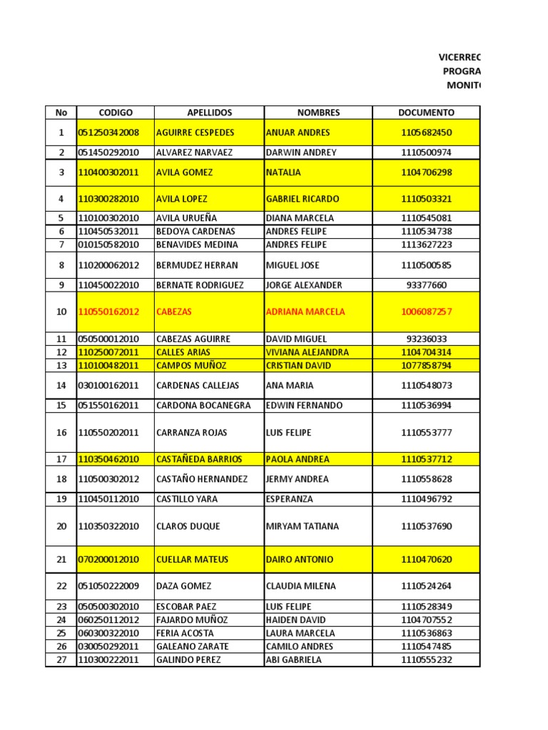 No 1 2 3 4 5 6 7 8 9 10 11 12 13 14 15 16 17 18 19 20 21 22 23 24 25 26 27 CODIGO 051250342008 051450292010 110400302011 110300282010 110100302010 110450532011 010150582010 110200062012 110450022010 110550162012 050500012010 110250072011 110100482011 030100162011 051550162011 110550202011 110350462010 110500302012 110450112010 110350322010 070200012010 051050222009 050500302010 060250112012 060300322010 030050292011 110300222011 APELLIDOS AGUIRRE CESPEDES ALVAREZ NARVAEZ AVILA GOMEZ AVILA LOPEZ AVILA URUEA BEDOYA CARDENAS BENAVIDES MEDINA BERMUDEZ HERRAN BERNATE RODRIGUEZ CABEZAS CABEZAS AGUIRRE CALLES ARIAS CAMPOS MUOZ CARDENAS CALLEJAS CARDONA BOCANEGRA CARRANZA ROJAS CASTAEDA BARRIOS CASTAO HERNANDEZ CASTILLO YARA CLAROS DUQUE CUELLAR MATEUS DAZA GOMEZ ESCOBAR PAEZ FAJARDO MUOZ FERIA ACOSTA GALEANO ZARATE GALINDO PEREZ NOMBRES ANUAR ANDRES DARWIN ANDREY NATALIA GABRIEL RICARDO DIANA MARCELA ANDRES FELIPE ANDRES FELIPE MIGUEL JOSE JORGE ALEXANDER ADRIANA MARCELA DAVID MIGUEL VIVIANA ALEJANDRA CRISTIAN DAVID ANA MARIA EDWIN FERNANDO LUIS FELIPE PAOLA ANDREA JERMY ANDREA ESPERANZA MIRYAM TATIANA DAIRO ANTONIO CLAUDIA MILENA LUIS FELIPE HAIDEN DAVID LAURA MARCELA CAMILO ANDRES ABI GABRIELA DOCUMENTO 1105682450 1110500974 1104706298 1110503321 1110545081 1110534738 1113627223 1110500585 93377660 1006087257 93236033 1104704314 1077858794 1110548073 1110536994 1110553777 1110537712 1110558628 1110496792 1110537690 1110470620 1110524264 1110528349 1104707552 1110536863 1110547485 1110555232