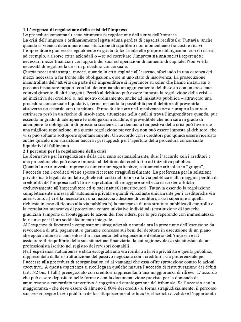 si rende necessaria anche una rinuncia a quote di capitale . Altre volte poi preveduta la conversione di quote di credito in capitale: Trattasi di misura adottata nelle crisi di maggiore gravit e tuttavia pi di frequente di quanto si possa pensare. 4) Liter della composizione stragiudiziale Liter i momenti essenziali possono cos riassumersi: a) individuazione delle cause della crisi ed evidenziazione della situazione reale, senza lasciarsi prendere dalla tentazione di mascherarla con inopportune operazioni di manipolazione di bilanci; b) scelta di un advisor, chiamato in primo luogo ad informare della crisi i soggetti i cui interessi sono coinvolti nella crisi e la cui credibilit possa costituire per essi una adeguata garanzia. In questa fase lattenzione deve essere volta ed e vitare comportamenti, da parte dei creditori, che pregiudichino la prosecuzione dellattivit dimpresa e in definitiva, lattuazione del piano, come liscrizione di ipoteche giudiziali, manovre della concorrenza dirette a sottrarre clientela o il personale pi qualificato. c) predisposizione del piano industriale e finanziario, che va elaborato con la supervisione delladvisor e che destinato a costituire la base della convenzione; d) predisposizione della bozza di convenzione, volta a regolare il rapporto con le banche ed eventualmente con gli altri creditori, che va inviata a cura delladvisor ed illustrata alle banche creditrici ed eventualmente con gli altri creditori, che va inviata a cura delladvisor ed illustrata alle banche creditrici ed eventualmente ali altri creditori ai quali viene richiesto un qualche sacrificio. La proposta va discussa e, se del caso modificata, al fine di assicurare adesioni in misura non inferiore al quorum. e) dopo la sottoscrizione della convenzione occorre procedere alla attuazione del piano in conformit al programma, ponendo in essere gli accorgimenti necessari ad evitare manovre di distrurbo da parte degli altri creditori. 5) Finalit della composizione stragiudiziale la composizione stragiudiziale delle crisi mira di regola al ripristino dellequilibrio finanziario ed al salvataggio dellimpresa non implica necessariamente il salvataggio dellimprenditore. Si gi ricordato che una delle modalit del piano pu essere quella della conversione di crediti in capitale. lentrata delle banche nel capitale non soltanto consente un controllo dellimpresa dallinterno, ma pu preludere alla estromissione del gruppo di comando: il vecchio gruppo di comando pu, secondo i casi, mantenere la propria posizione di controllo o essere estromesso, fin dal principio nel corso delloperazione. Non sempre la conservazione dellazienda o dei complessi aziendali possibile e la composizione stragiudiziale della crisi pu essere programmata in funzione liquidativa del patrimonio. CAPITOLO UNDICESIMO IL CONCORDATO PREVENTIVO 1) Dalla legislazione del 1942 alla riforma del 2005 Lo strumento giudiziale di regolazione della crisi attraverso accordi con i creditori destinati ad essere perfezionati sotto la protezione del tribunale il concordato preventivo. Prima della riforma attuata con il d.l. 14 marzo 2005, n. 35,convertito nella l. 14 maggio 2005, n. 80, il concordato preventivo era concepito come strumento di prevenzione del fallimento, del quale poteva beneficiare limprenditore onesto e sfortunato quando fosse in grado di assicurare ai creditori un soddisfacimento apprezzabile. Perci il concordato preventivo: 1) poteva essere proposta dellimprenditore insolvente 2) purch sussistessero determinati requisiti soggettivi, essenzialmente al fine di precludere ai