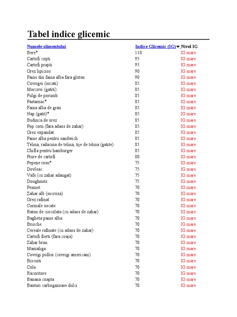 Numele alimentului Bere* Cartofi copti Cartofi prajiti Orez lipicios Paine din faina alba fara gluten Co rigei !uscati" $orco i !gatiti" %ulgi de porumb Pastarnac* %aina alba de grau &ap !gatit"* Budinca de orez Pop corn !fara adaos de za'ar" Orez e(pandat Paine alba pentru sand)ic' *elina+ radacina de telina+ tije de telina !gatite" C'ifla pentru 'amburger Piure de cartofi Pepene rosu* -o leac .afe !cu za'ar adaugat" -oug'nuts Pesmet /a'ar alb !sucroza" Orez rafinat Curmale uscate Baton de ciocolata !cu adaos de za'ar" Bag'eta paine alba Brioc'e Cereale rafinate !cu adaos de za'ar" Cartofi fierti !fara coaja" /a'ar brun $amaliga Co rigi pufosi !co rigi americani" Biscuiti Cola 0acoritore Banana coapta Bauturi carbogazoase dulci Indice Glicemic (IG) 110 95 95 90 90 #5 #5 #5 #5 #5 #5 #5 #5 #5 #5 #5 #5 #0 ,5 ,5 ,5 ,5 ,0 ,0 ,0 ,0 ,0 ,0 ,0 ,0 ,0 ,0 ,0 ,0 ,0 ,0 ,0 ,0 ,0 Nivel IG IG mare IG mare IG mare IG mare IG mare IG mare IG mare IG mare IG mare IG mare IG mare IG mare IG mare IG mare IG mare IG mare IG mare IG mare IG mare IG mare IG mare IG mare IG mare IG mare IG mare IG mare IG mare IG mare IG mare IG mare IG mare IG mare IG mare IG mare IG mare IG mare IG mare IG mare IG mare