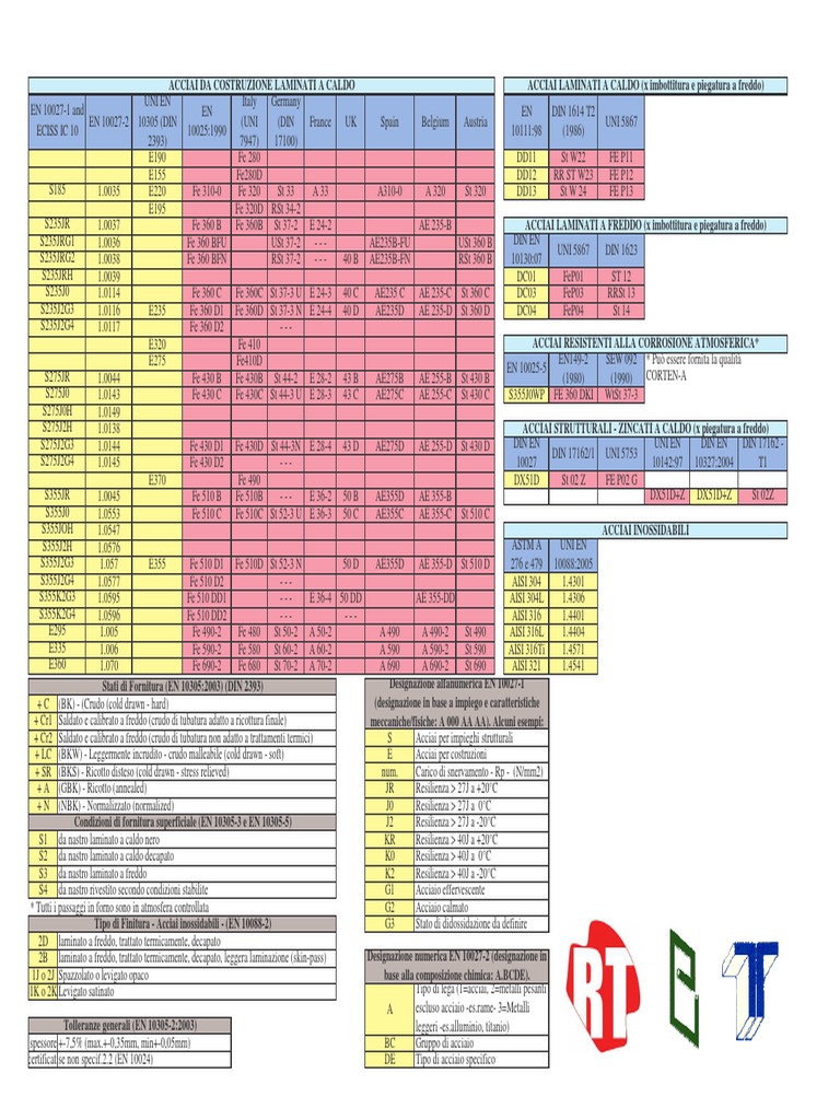 ACCIAI LAMINATI A FREDDO (x imbottitura e piegatura a freddo) DIN EN UNI 5867 DIN 1623 10130:07 DC01 FeP01 ST 12 DC03 FeP03 RRSt 13 DC04 FeP04 St 14 ACCIAI RESISTENTI ALLA CORROSIONE ATMOSFERICA* EN149-2 SEW 092 * Pu essere fornita la qualit CORTEN-A (1980) (1990) S355J0WP FE 360 DKI WtSt 37-3 ACCIAI STRUTTURALI - ZINCATI A CALDO (x piegatura a freddo) DIN EN UNI EN DIN EN DIN 17162 DIN 17162/1 UNI 5753 10027 10142:97 10327:2004 T1 DX51D St 02 Z FE P02 G DX51D+Z DX51D+Z St 02Z UNI EN 10088:2005 1.4301 1.4306 1.4401 1.4404 1.4571 1.4541 ACCIAI INOSSIDABILI