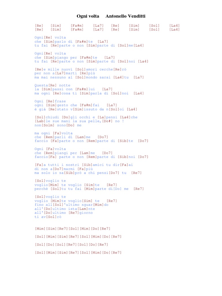 Ogni[Re] volta che [Sim]parlo di [Fa#m]te [La7] tu fai [Re]parte o non [Sim]parte di [Sol]me[La4] Ogni[Re] volta che [Sim]piango per [Fa#m]te [La7] tu fai [Re]parte o non [Sim]parte di [Sol]noi [La4] [Re]e mille nuovi [Sol]amori cerche[Re]r per non a[La7]marti [Re]pi ma mai nessuno al [Sol]mondo sarai [La4]tu Questa[Re] notte la [Sim]passi con [Fa#m]lui [La7] ma ogni [Re]cosa ti [Sim]parla di [Sol]noi