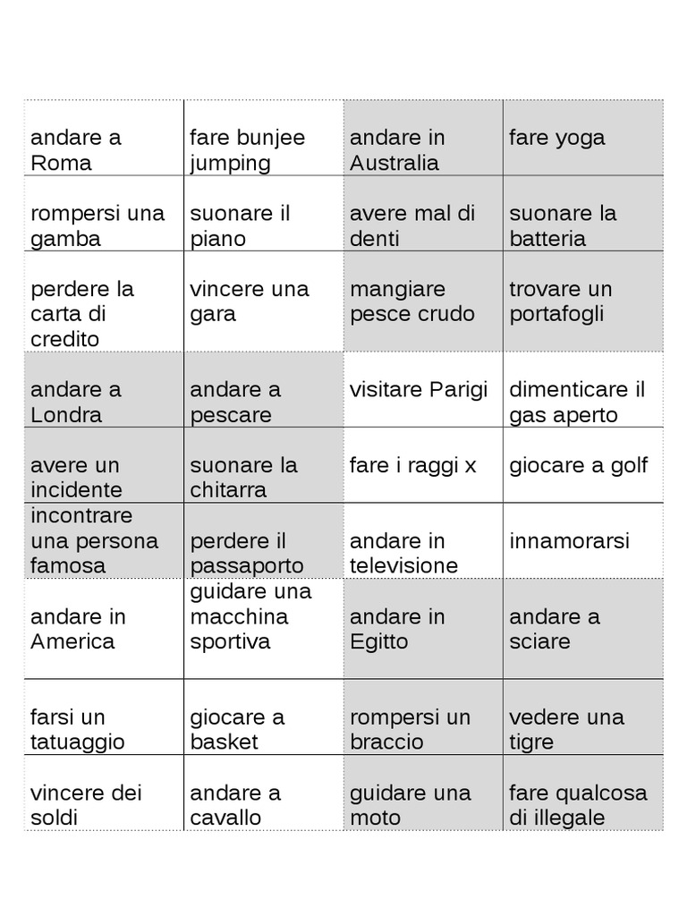 visitare Parigi dimenticare il gas aperto fare i raggi x andare in televisione andare in Egitto rompersi un braccio guidare una moto giocare a golf innamorarsi andare a sciare vedere una tigre fare qualcosa di illegale