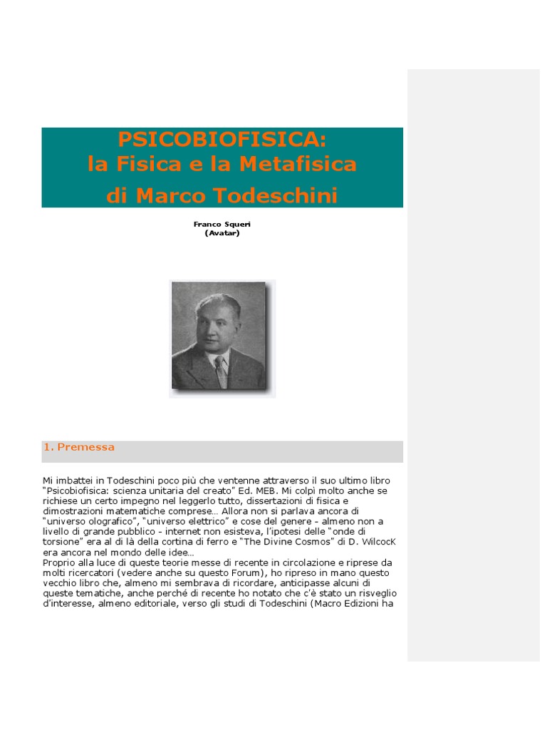 Mi imbattei in Todeschini poco pi che ventenne attraverso il suo ultimo libro Psicobiofisica: scienza unitaria del creato Ed. MEB. Mi colp molto anche se richiese un certo impegno nel leggerlo tutto, dissertazioni di fisica e dimostrazioni matematiche comprese Allora non si parlava ancora di universo olografico, universo elettrico e cose del genere - almeno non a livello di grande pubblico - internet non esisteva, lipotesi delle onde di torsione era al di l della cortina di ferro e The Divine Cosmos di D. WilcocK era ancora nel mondo delle idee Proprio alla luce di queste teorie messe di recente in circolazione e riprese da molti ricercatori (vedere anche su questo Forum), ho ripreso in mano questo vecchio libro che, almeno mi sembrava di ricordare, anticipasse alcuni di queste tematiche, anche perch di recente ho notato che c stato un risveglio dinteresse, almeno editoriale, verso gli studi di Todeschini (Macro Edizioni ha