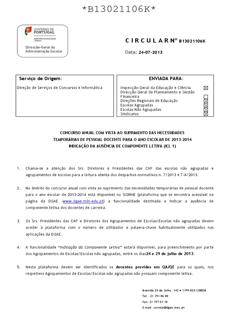 No mbito do concurso anual com vista ao suprimento das necessidades temporrias de pessoal docente para o ano escolar de 2013-2014 est disponvel no SIGRHE (plataforma que se encontra acessvel na pgina da DGAE -www.dgae.min-edu.pt) a funcionalidade destinada a indicar a ausncia de componente letiva dos docentes de carreira.
