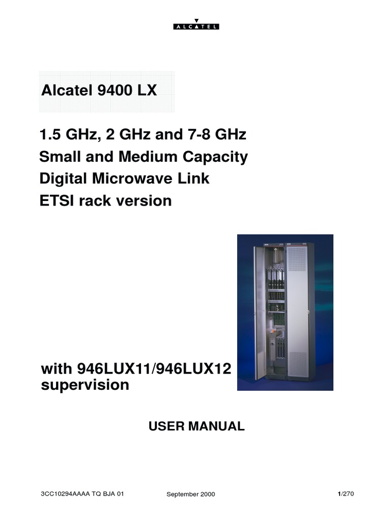 2 Description of the equipment . . . . . . . . . . . . . . . . . . . . . . . . . . . . . . . . . . . . . . . . . . . . . . . . . . . . . . . 2.1 General characteristics of the equipment . . . . . . . . . . . . . . . . . . . . . . . . . . . . . . . . . . . . . . . . . . 2.2 Operation of the equipment in 1+0 configuration . . . . . . . . . . . . . . . . . . . . . . . . . . . . . . . . . . . . 2.3 Operation of the equipment in 1+1 configurations . . . . . . . . . . . . . . . . . . . . . . . . . . . . . . . . . . . 2.3.1 1+1 HSB configuration . . . . . . . . . . . . . . . . . . . . . . . . . . . . . . . . . . . . . . . . . . . . . . . . . . 2.3.2 1+1 HSB/DIV configuration . . . . . . . . . . . . . . . . . . . . . . . . . . . . . . . . . . . . . . . . . . . . . . 2.3.3 1+1 FD configuration . . . . . . . . . . . . . . . . . . . . . . . . . . . . . . . . . . . . . . . . . . . . . . . . . . . 2.3.4 Hybrid 1+1 FD/DIV configuration . . . . . . . . . . . . . . . . . . . . . . . . . . . . . . . . . . . . . . . . . 2.3.5 1+1 configuration with occasional backup . . . . . . . . . . . . . . . . . . . . . . . . . . . . . . . . . . 2.4 Equipment operation in N+1 configurations (1<N<6) . . . . . . . . . . . . . . . . . . . . . . . . . . . . . . . . 2.5 Configurations with space diversity . . . . . . . . . . . . . . . . . . . . . . . . . . . . . . . . . . . . . . . . . . . . . . . 2.6 Engineering service channels . . . . . . . . . . . . . . . . . . . . . . . . . . . . . . . . . . . . . . . . . . . . . . . . . . . . 2.6.1 ESC number 1 . . . . . . . . . . . . . . . . . . . . . . . . . . . . . . . . . . . . . . . . . . . . . . . . . . . . . . . . . 2.6.2 Engineering service channel No 2 . . . . . . . . . . . . . . . . . . . . . . . . . . . . . . . . . . . . . . . . 2.6.3 ESC numbers 3 to 5 . . . . . . . . . . . . . . . . . . . . . . . . . . . . . . . . . . . . . . . . . . . . . . . . . . . . 2.7 Remote indications and remote controls (TS/TC) . . . . . . . . . . . . . . . . . . . . . . . . . . . . . . . . . . . 2.7.1 Basic equipment . . . . . . . . . . . . . . . . . . . . . . . . . . . . . . . . . . . . . . . . . . . . . . . . . . . . . . . 2.7.2 16 TS/TC option . . . . . . . . . . . . . . . . . . . . . . . . . . . . . . . . . . . . . . . . . . . . . . . . . . . . . . . 2.8 Loopback options . . . . . . . . . . . . . . . . . . . . . . . . . . . . . . . . . . . . . . . . . . . . . . . . . . . . . . . . . . . . . . 2.9 9400 LX network . . . . . . . . . . . . . . . . . . . . . . . . . . . . . . . . . . . . . . . . . . . . . . . . . . . . . . . . . . . . . . . 2.10 Equipment management . . . . . . . . . . . . . . . . . . . . . . . . . . . . . . . . . . . . . . . . . . . . . . . . . . . . . . . 2.11 Controls, indications and connectors on the rack control panel . . . . . . . . . . . . . . . . . . . . . . 2.12 List of boards . . . . . . . . . . . . . . . . . . . . . . . . . . . . . . . . . . . . . . . . . . . . . . . . . . . . . . . . . . . . . . . . . 2.12.1 Boards common to the various frequency bands . . . . . . . . . . . . . . . . . . . . . . . . . . . 2.12.2 Boards specific to the various frequency bands . . . . . . . . . . . . . . . . . . . . . . . . . . . . 2.13 Technical and mechanical specifications . . . . . . . . . . . . . . . . . . . . . . . . . . . . . . . . . . . . . . . . .