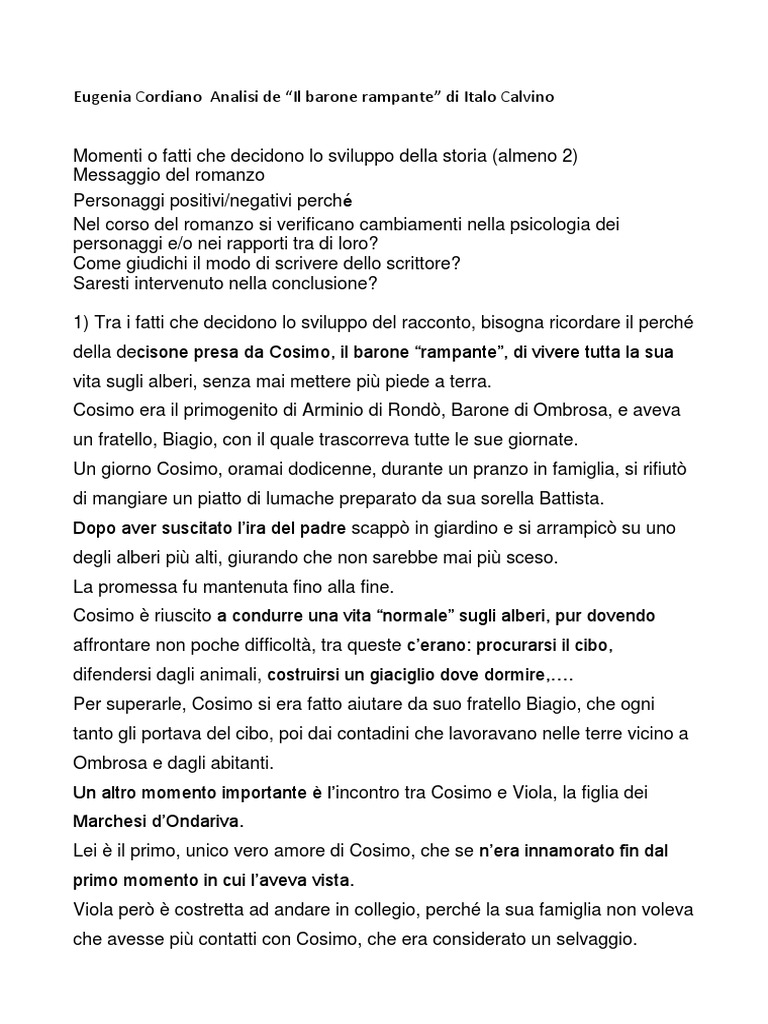 Momenti o fatti che decidono lo sviluppo della storia (almeno 2) Messaggio del romanzo Personaggi positivi/negativi perch Nel corso del romanzo si verificano cambiamenti nella psicologia dei personaggi e/o nei rapporti tra di loro? Come giudichi il modo di scrivere dello scrittore? Saresti intervenuto nella conclusione? 1) Tra i fatti che decidono lo sviluppo del racconto, bisogna ricordare il perch della decisone presa da Cosimo, il barone rampante, di vivere tutta la sua vita sugli alberi, senza mai mettere pi piede a terra. Cosimo era il primogenito di Arminio di Rond, Barone di Ombrosa, e aveva un fratello, Biagio, con il quale trascorreva tutte le sue giornate. Un giorno Cosimo, oramai dodicenne, durante un pranzo in famiglia, si rifiut di mangiare un piatto di lumache preparato da sua sorella Battista. Dopo aver suscitato lira del padre scapp in giardino e si arrampic su uno degli alberi pi alti, giurando che non sarebbe mai pi sceso. La promessa fu mantenuta fino alla fine. Cosimo riuscito a condurre una vita normale sugli alberi, pur dovendo affrontare non poche difficolt, tra queste cerano: procurarsi il cibo, difendersi dagli animali, costruirsi un giaciglio dove dormire,. Per superarle, Cosimo si era fatto aiutare da suo fratello Biagio, che ogni tanto gli portava del cibo, poi dai contadini che lavoravano nelle terre vicino a Ombrosa e dagli abitanti. Un altro momento importante lincontro tra Cosimo e Viola, la figlia dei Marchesi dOndariva. Lei il primo, unico vero amore di Cosimo, che se nera innamorato fin dal primo momento in cui laveva vista. Viola per costretta ad andare in collegio, perch la sua famiglia non voleva che avesse pi contatti con Cosimo, che era considerato un selvaggio.