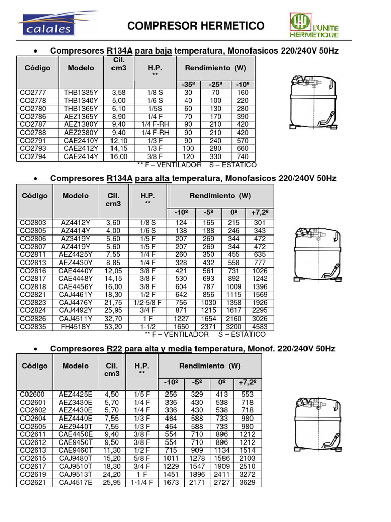 Compresores R134A para baja temperatura, Monofasicos 220/240V 50Hz