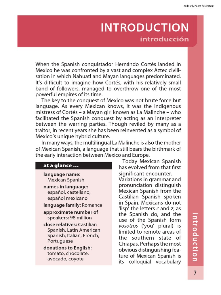 that sets it apart from Castilian Spanish, as well as the forms of Spanish spoken in neighbouring Latin American countries (see Lonely Planet’s Spanish Phrasebook, Costa Rica Spanish Phrasebook and Latin American Spanish Phrasebook). The indigenous languages that first baffled Cortés have had a considerable impact on Mexican Spanish, especially in words to do with food, flora, fauna and place names (including the word México itself). Nahuatl words, such as avocado and tomato, have even made it into the English language. These days US English is possibly the strongest influence on Mexi- can Spanish, particularly in the northern border areas where Mexicans are known to accommodate some English words in everyday conversation. Getting acquainted with Mexican Spanish is easy. In many ways, the pronunciation is similar to English, and visitors soon fall for the beauty of the Mexican accent with its cantering rhythm and plaintive rising and falling. If you’re already familiar with the Spanish spoken in Spain or elsewhere in Latin America you’ll have no problem learning the basic differences, and locals will warm to your efforts to use the appropriate Mexican words and expressions. This book gives you all the practical vocabulary and phrases you need to get by as well as all the fun, spontaneous phrases that lead to a better understanding of Mexico and its people. Need more encouragement? Remember, the contact you make using Mexican Spanish will make your travels unique. Local knowledge, new relationships and a sense of satisfaction are on the tip of your tongue, so don’t just stand there, say something!