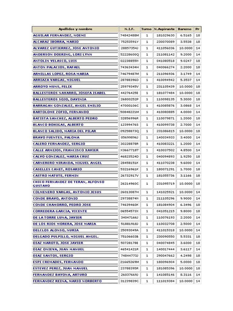 Questo documento contiene un elenco di nomi, numeri di identificazione fiscale, punteggi e altre informazioni relative a diversi aspiranti. L'elenco include oltre 100 voci con informazioni su ciascun candidato.