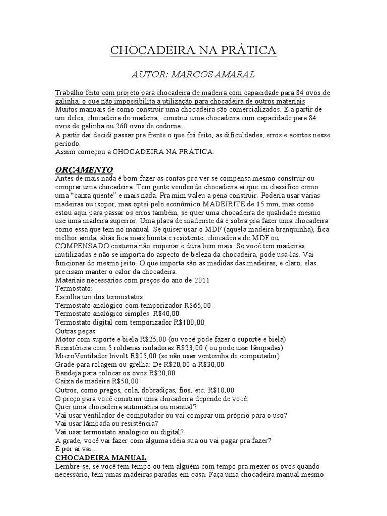 necessrio, tem umas madeiras paradas em casa. Faa uma chocadeira manual mesmo.