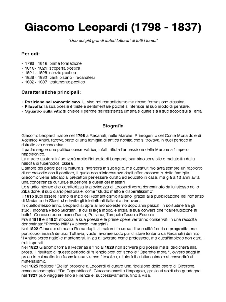 Giacomo Leopardi nasce nel 1798 a Recanati, nelle Marche. Primogenito del Conte Monaldo e di