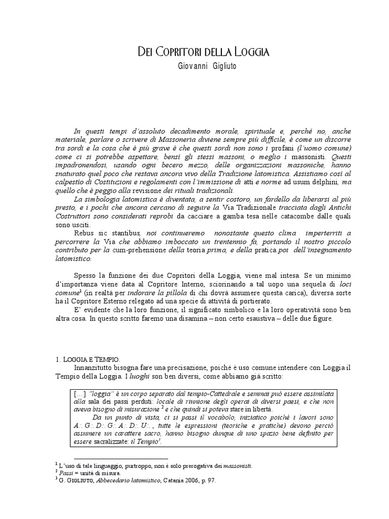 entrare in Loggia non sia un intruso. A tal uopo procede alla tegolatura, cio ergendosi come