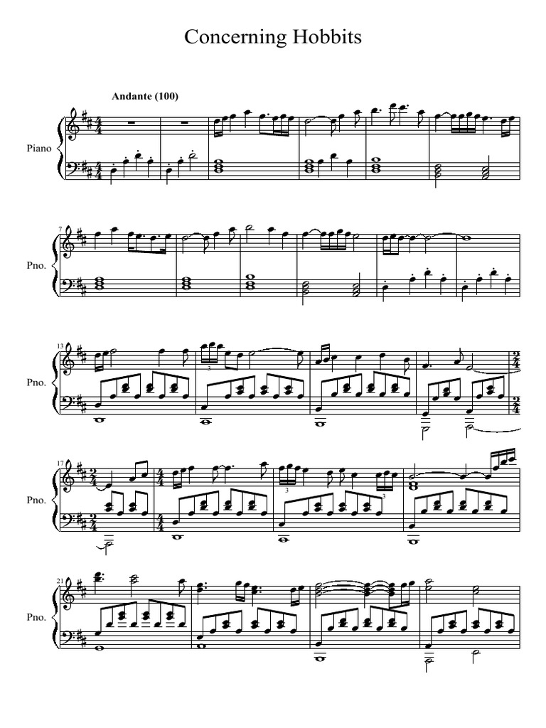 Il documento parla di Hobbit e contiene numerose notazioni musicali e numeri di pagina. Descrive probabilmente una composizione musicale relativa agli Hobbit.