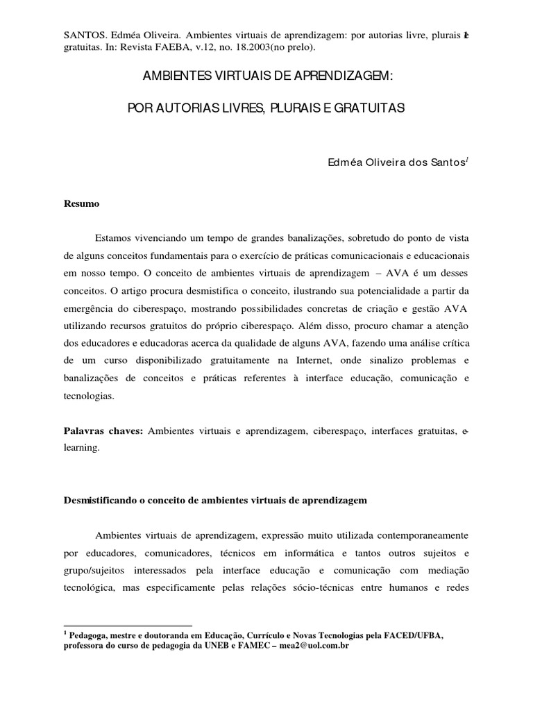 SANTOS. Edma Oliveira. Ambientes virtuais de aprendizagem: por autorias livre, plurais18e