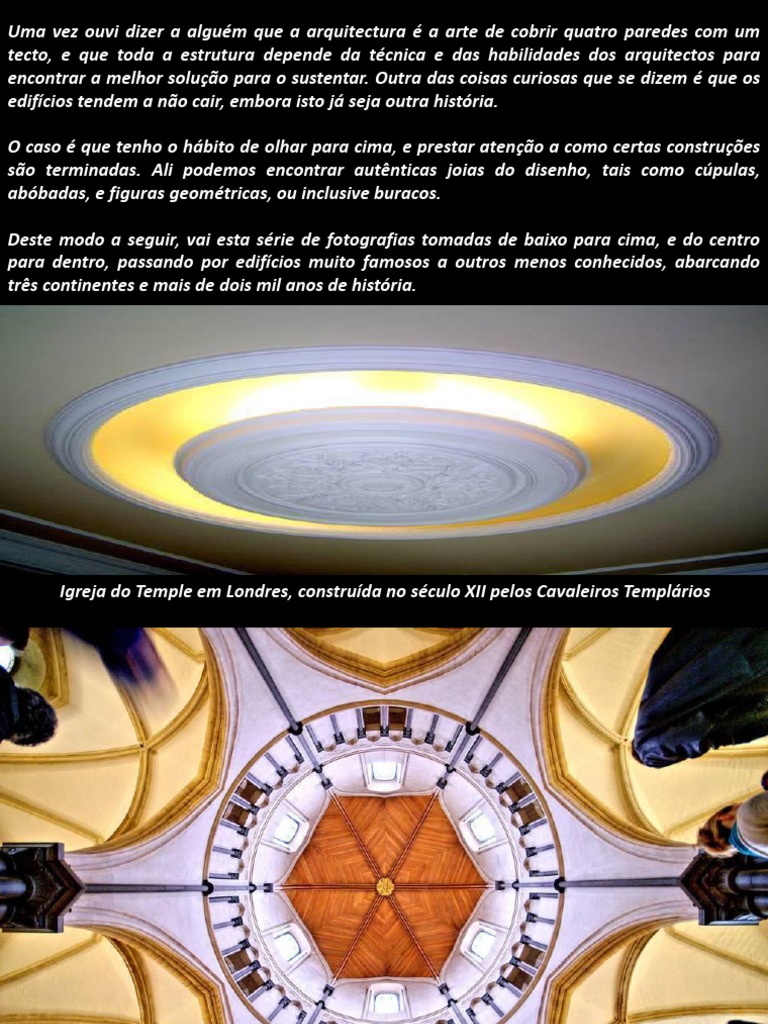 Deste modo a seguir, vai esta série de fotografias tomadas de baixo para cima, e do centro para dentro, passando por edifícios muito famosos a outros menos conhecidos, abarcando