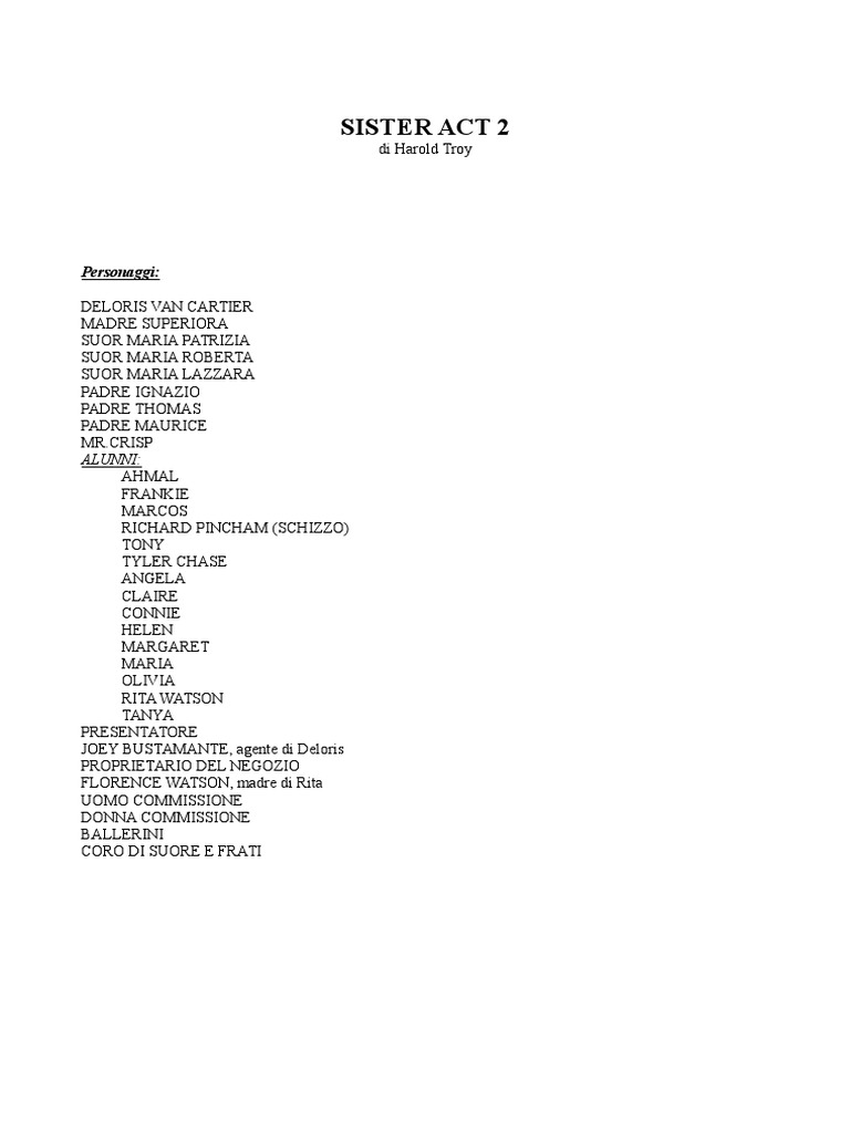 In scena il Presentatore, Deloris e i ballerini. Tra il pubblico Suor Maria Patrizia, Suor Maria Roberta e