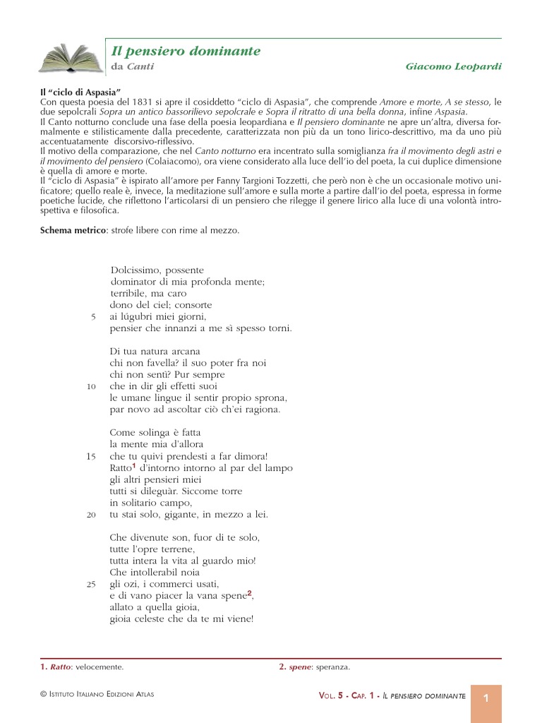 Il canto si chiude, comera iniziato, con la parola pensiero che richiama il titolo e conferma linnovativa scelta di Leopardi di sostituire allamore della tradizione lirica il pensiero poetico.