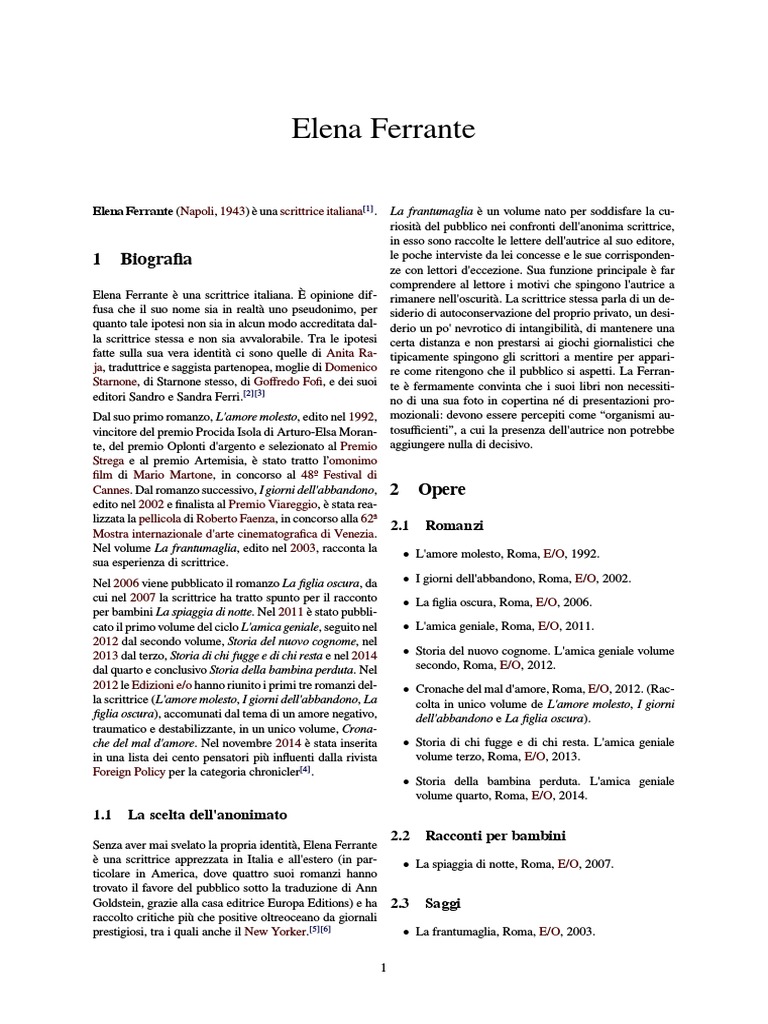 Elena Ferrante una scrittrice italiana. opinione dif- rimanere nell'oscurit. La scrittrice stessa parla di un defusa che il suo nome sia in realt uno pseudonimo, per siderio di autoconservazione del proprio privato, un desiquanto tale ipotesi non sia in alcun modo accreditata dal- derio un po' nevrotico di intangibilit, di mantenere una