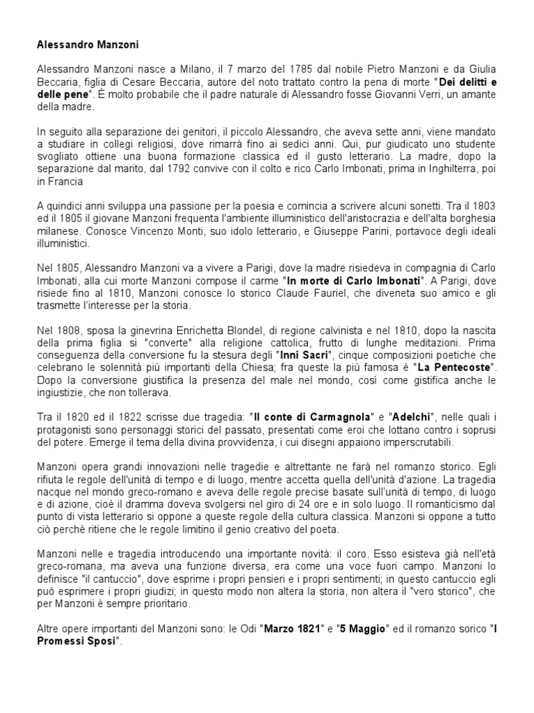 Altre opere importanti del Manzoni sono: le Odi "Marzo 1821" e "5 Maggio" ed il romanzo sorico "I