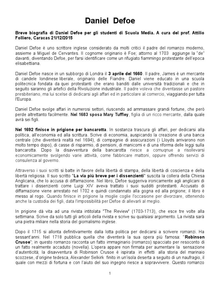 Breve biografia di Daniel Defoe per gli studenti di Scuola Media. A cura del prof. Attilio