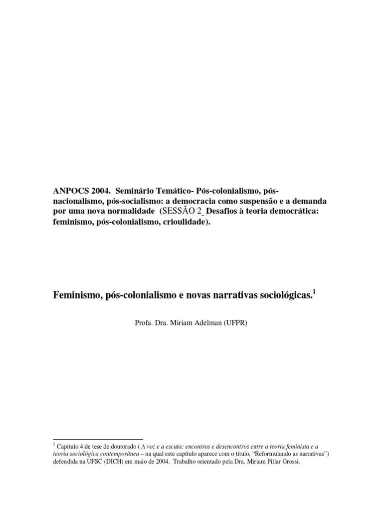 narrativa sociolgica clssica que vem, desde o campo da teoria ou dos estudos pscoloniais, considerando por sua vez o entrecruzamento possvel entre ambas as