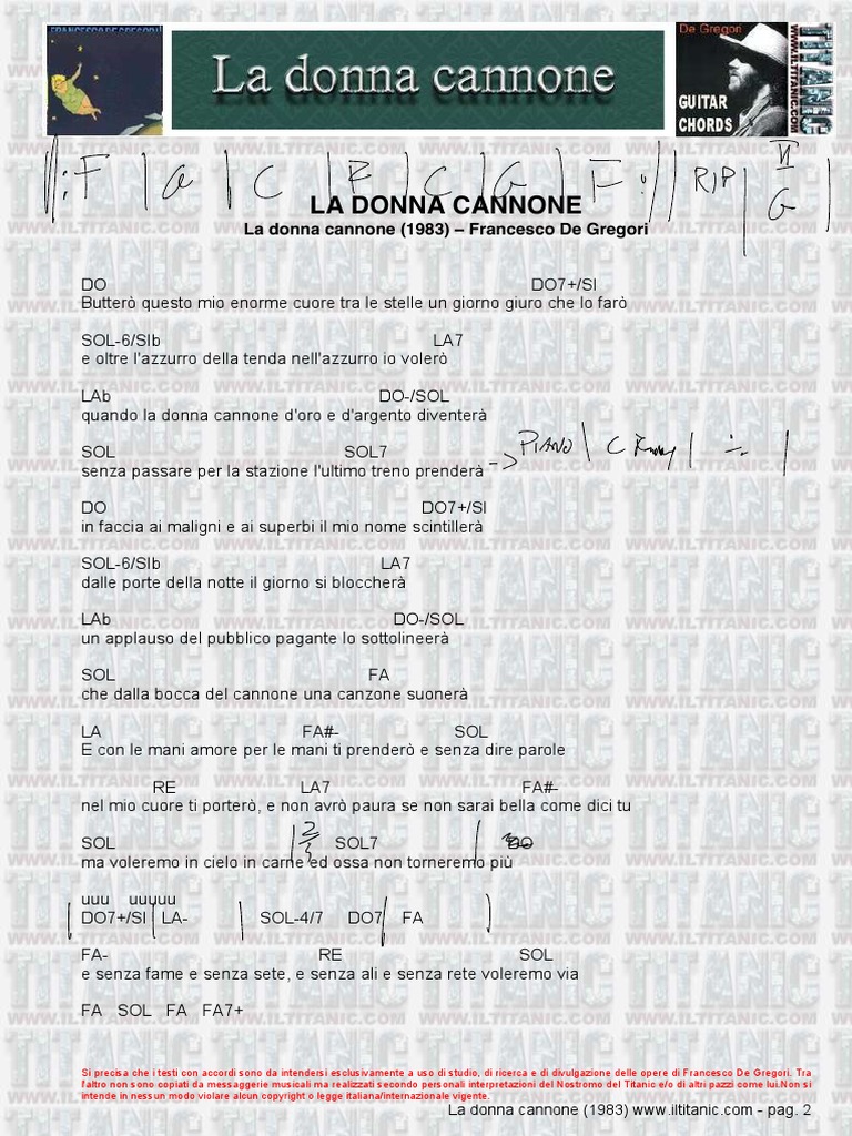 Si precisa che i testi con accordi sono da intendersi esclusivamente a uso di studio, di ricerca e di divulgazione delle opere di Francesco De Gregori. Tra