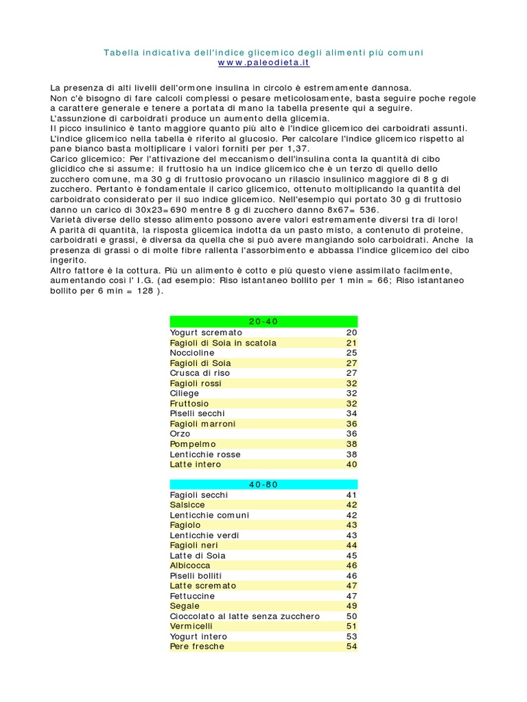 Tabella indicativa dell'indice glicemico degli alimenti pi comuni