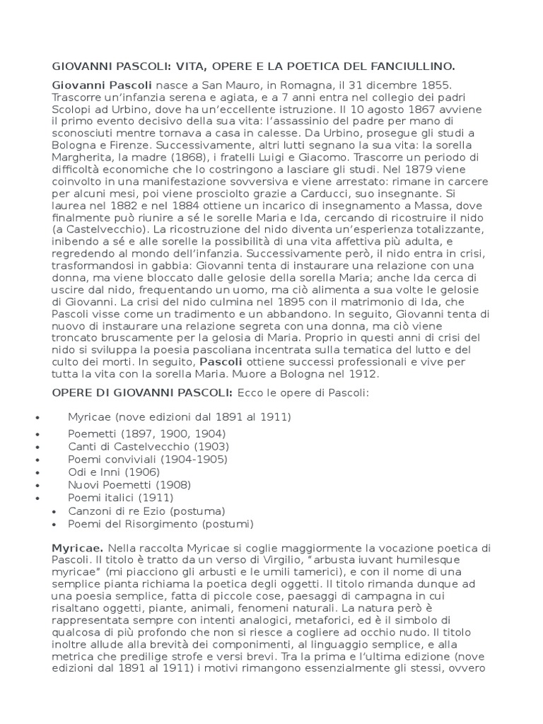 OPERE DI GIOVANNI PASCOLI: Ecco le opere di Pascoli: