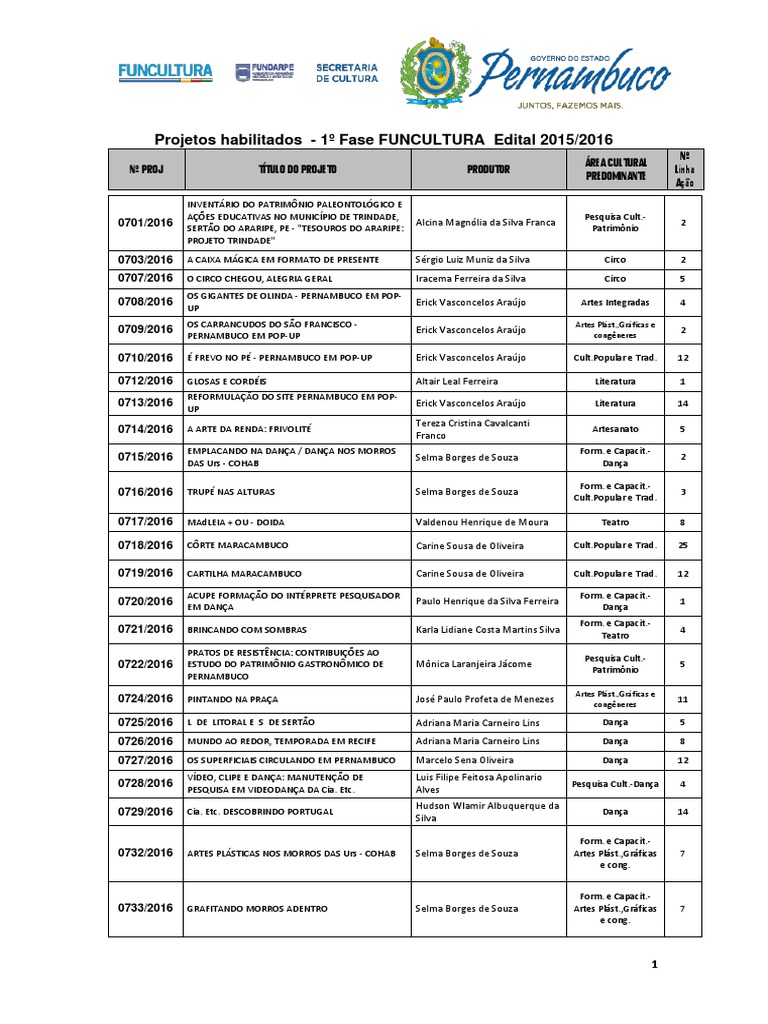 Projetos habilitados - 1 Fase FUNCULTURA Edital 2015/2016