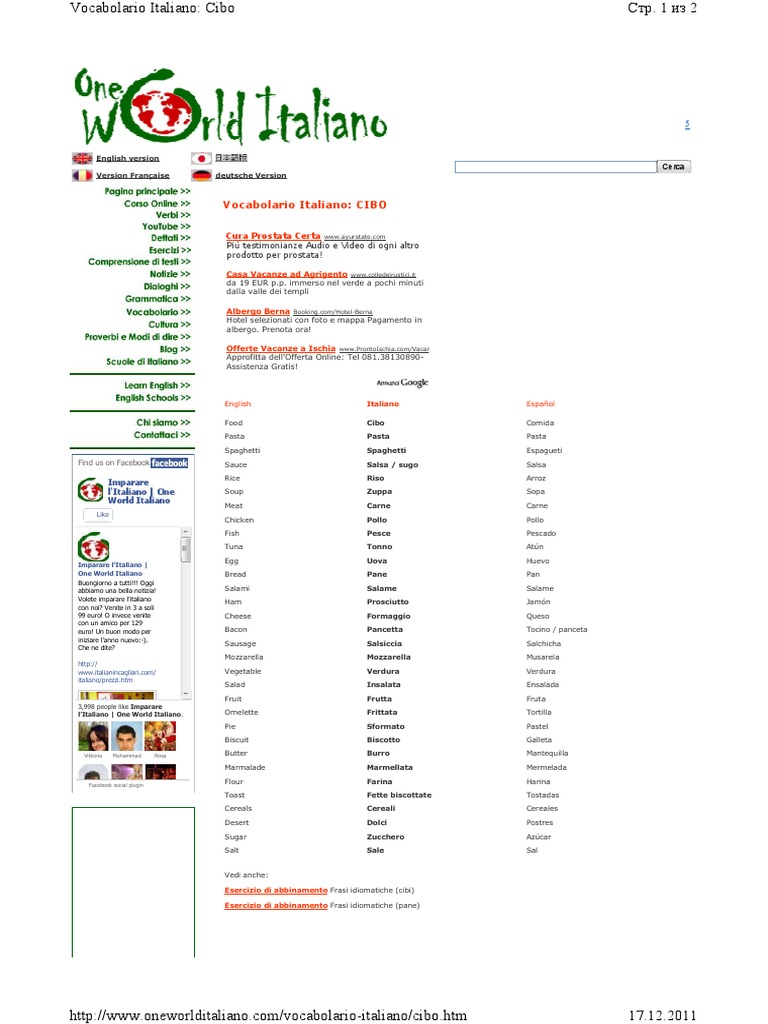 Vocabolario Italiano: Cibo